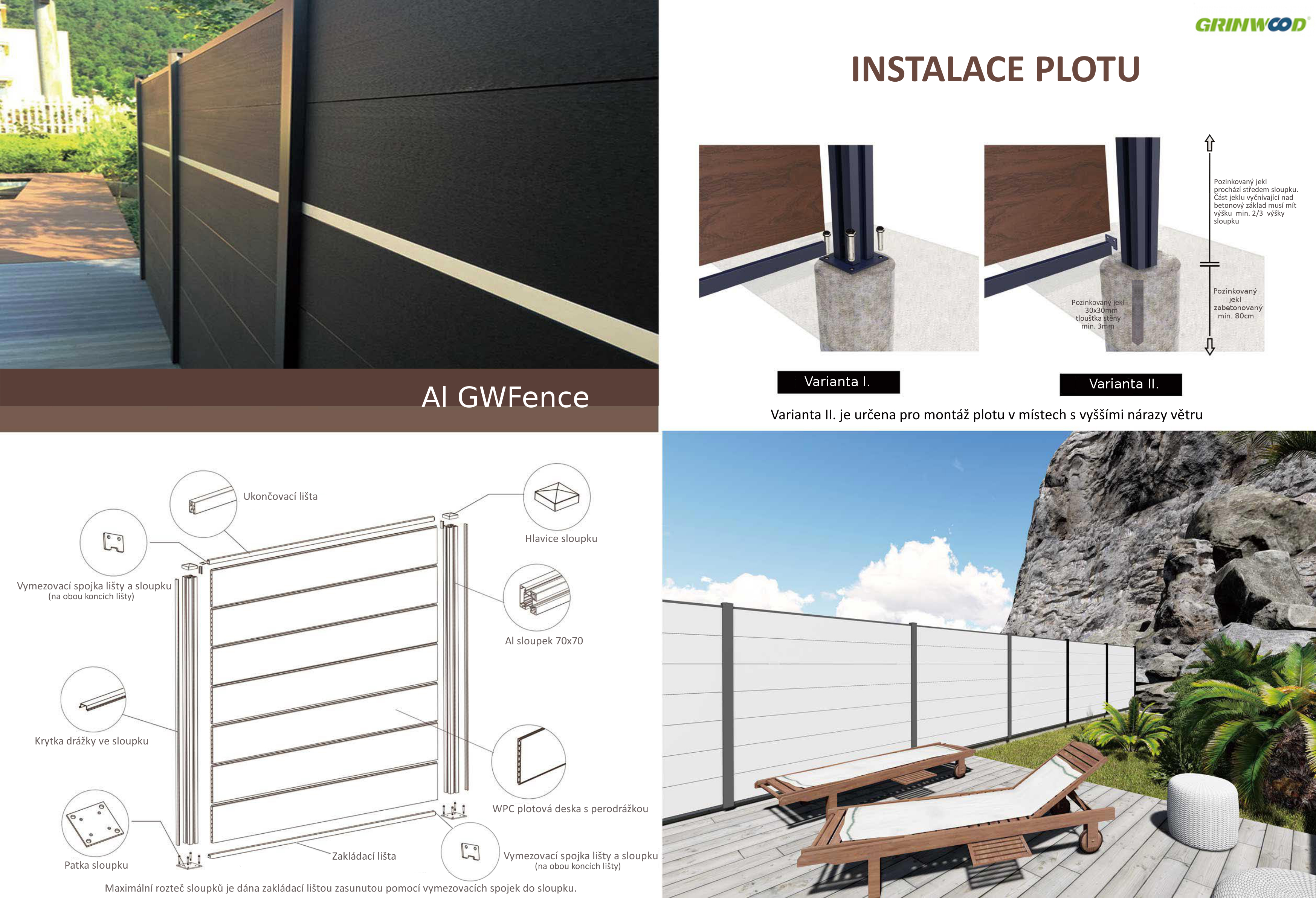 Stavebnicový systém GWFence vyniká neobvykle rychlou a snadnou montáží. Kombinuje dřevoplastové plotové desky s hliníkovými sloupky. Díky mnoha variantám odstínů a doplňků můžete popustit uzdu své fantazii a vytvořit jedinečné oplocení, zástěnu u bazénu či jiná skrytá zákoutí Vaší zahrady. Buďte originální a trendy nejen při zařizování interiéru domu, ale i jeho okolí. Systém perodrážky vytváří celistvou plochu bez mezer k zajištění maximálního soukromí na Vaší zahradě. Pro vzdušnější oplocení či zástěnu lze do plochy umístit libovolný počet dekoračních panelů.
